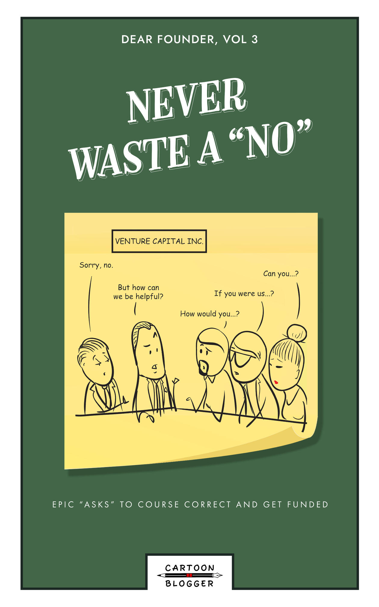Never Waste a No” is one in the “Dear Founder” series published by Cartoon Blogger book publishing. Cartoon Blogger was inspired by the following quote: